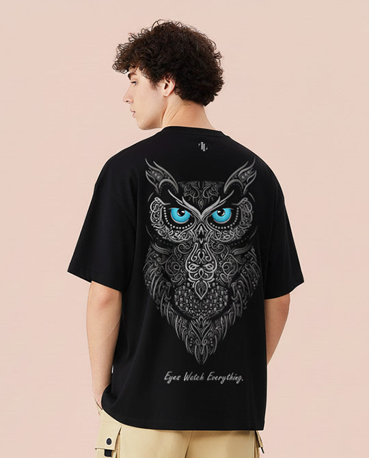 +Step into bold streetwear with the Loom & Looster Silent Step Owl Oversized T- shirt. Crafted from 240 GSM premium terry cotton, this heavyweight tee delivers durability, comfort, and a luxe oversized fit. The front showcases a bold screen-printed quote, while the back features a striking owl design enhanced with radiant eye detailing, puff print, and layered screen print, creating a textured, premium streetwear look. Designed in classic black, this oversized tee is perfect for those who move in silence but leave an unforgettable presence.